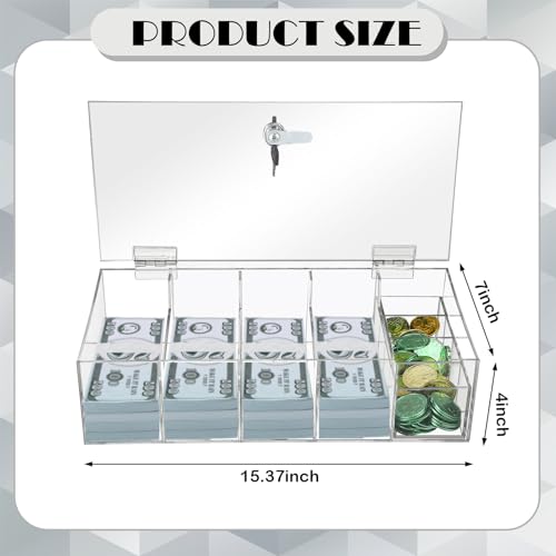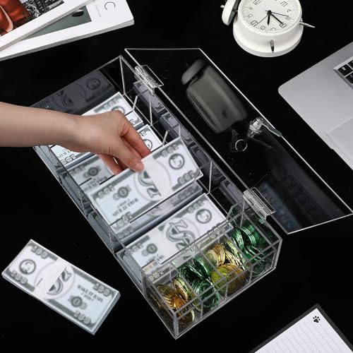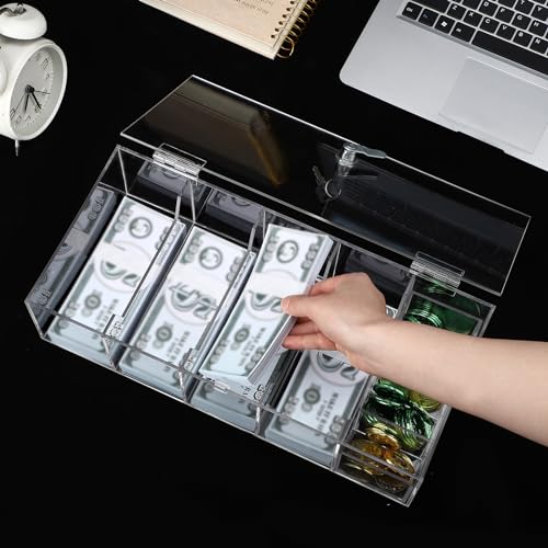 5 Compartment Design: you are provided with 1 piece of acrylic locking currency tray, thoughtfully designed, it comes with 5 separate compartments; This feature aids in the efficient organization and reduces the chaos often associated with money handling; Each compartment is spacious enough to hold a generous amount of currency, simplifying and streamlining your money management process