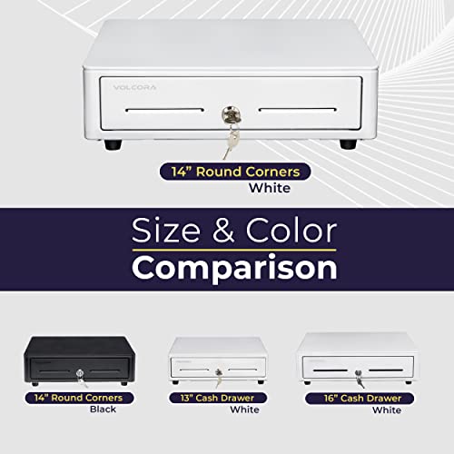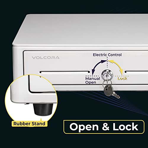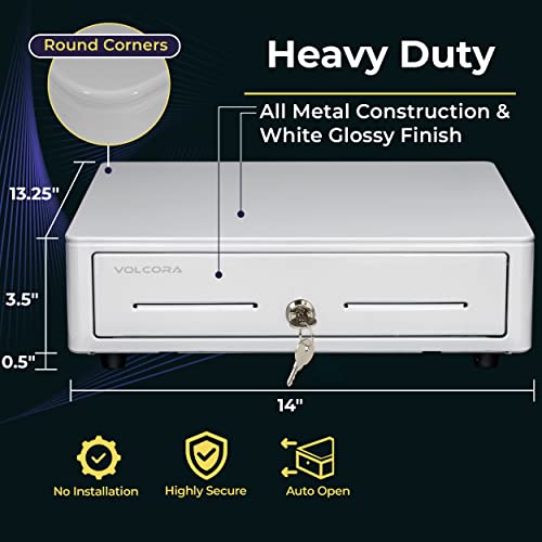 DURABLE POS CASH DRAWER: Volcora cash register drawer with round corners measures 14″x13.25″x4″, Color: white, and Voltage: 24VDC. Our cash drawer has a heavy duty durable metal frame that is an ideal cash register for small businesses and even big establishments too.
