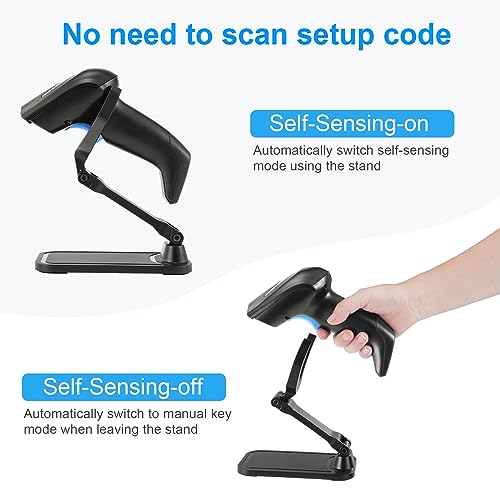 【Adjustable Stand】The wireless barcode scanner is equipped with an adjustable bracket, which can freely adjust the optimal scanning angle according to needs. In addition, through automatic induction scanning, hands-free scanning can be easily achieved without the need for handheld scanning.