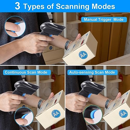 【3 Types of Scanning Modes】This Bar Code Scanners is equipped with button triggered scanning, automatic sensing scanning, and continuous scanning modes. We can choose different scanning methods according to our work needs. It has a 2000mAh super large battery and storage, which helps to be widely used in supermarkets, bookstores, logistics, warehouses, pharmacies, and other management documents and product inventory.